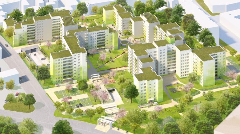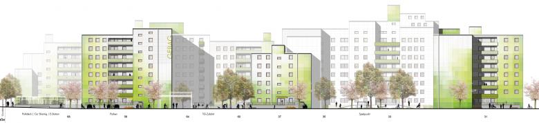 Ein neues Gesicht erhalten die Eingangsbereiche: Barrierearm gestaltet, vergrößert und begrünt; So entstehen aus Eingängen Adressen und aus Hausnummern werden Namensschilder. Die Treppenhäuser und Aufzüge renoviert, ein Quartiersplatz mit Quartiers-Café, Sportflächen und Spiellandschaften und vor allem die neue Fassadengestaltung werden den Citywohnpark aufleben lassen. Das Farbkonzept nimmt die Farbigkeit der Grünanlagen auf und antwortet auf die Frage des Citywohnparks mit „Wohnen im Park!“