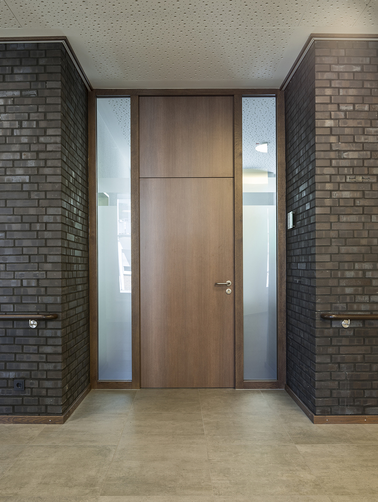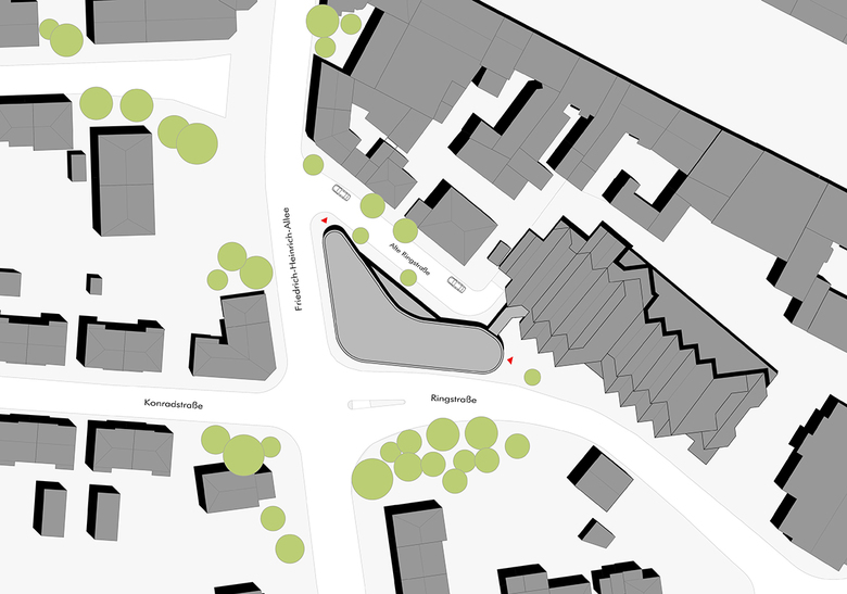 Über den kleinen Platzraum des Friederike-Fliedner Platzes, der städtebaulich durch eine Baumreihe zur Ringstraße gefasst ist, gelangen die Besucher zum neuen Eingang des Seniorenzentrums. Die Markthalle im Erdgeschoss als zentraler Kommunikationsort für Bewohner, Angehörige und Anwohner ist im Bereich der Straßenkreuzung Friedrich-Heinrich-Allee und Ringstraße angeordnet, so dass die Nutzer am städtischen Leben teilnehmen und die Aktivitäten in Straßenraum mit verfolgen können. Durch eine transparente Brücke - ausgebildet in Form einer gläsernen Fuge - werden der Neubau und der Gebäudebestand miteinander verbunden.
