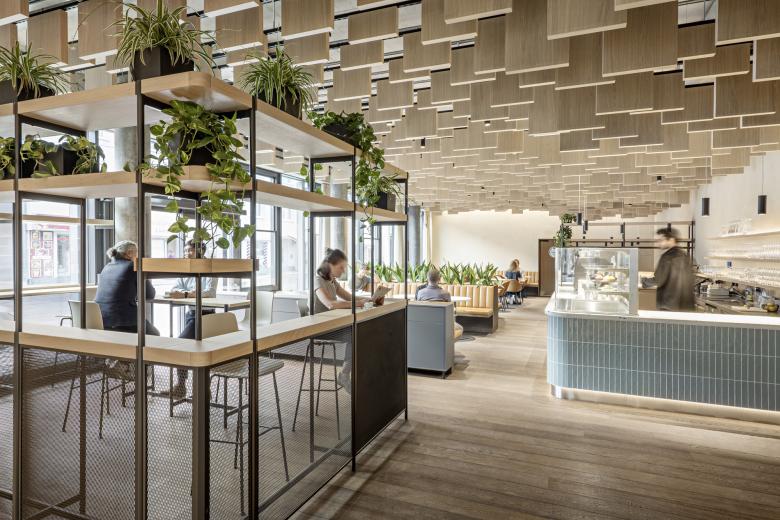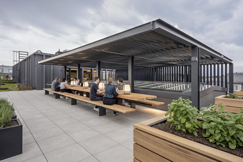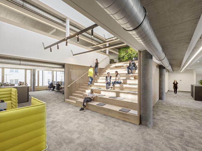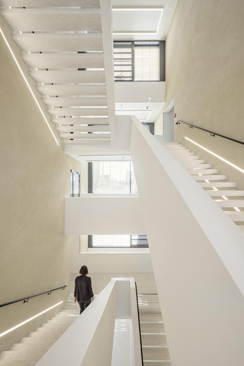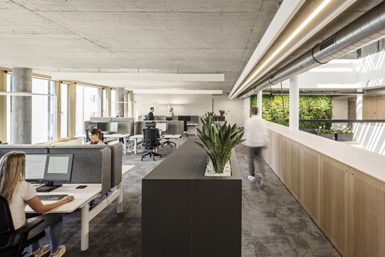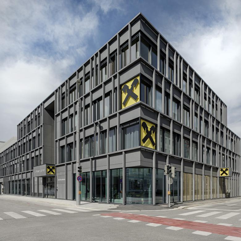 The new Raiffeisenbank headquarters in St. Pölten – the "raiffeisen corner" – is located on a prominent urban corner in the north of the city, not far from the railway station. The concept of the building allows for hybrid use and accommodates not only a bank branch and an advisory centre, but also a public restaurant and café, an event space, a co-working space and terraces on multiple floors. A formulated joint divides the building into two volumes. It marks the main entrance and contains the access to the four-storey building. The glass body serves as a vertical connection, allowing views to the outside into the street space and the quiet inner courtyard. The façade oscillates between openness and closedness. Horizontal cornices made of glass-fibre concrete wrap around the building over several storeys, contrasting generous glass surfaces, which are rhythmically broken by pilaster strips.