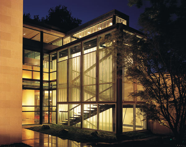 This residence represents a clear example of our modernist aesthetic. The glassy, open-plan house incorporates the latest in building technologies, such as new glass products from England and avant-garde structural systems. The exposed structural steel moment frame in the circulation spine and the thin columns and beams express the construction system for the house and its presence in an earthquake zone. Natural light from various sources - floors, ceilings, and walls - combine with translucent, transparent, and reflective materials to create visually dynamic spaces.