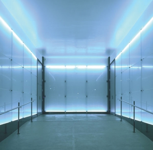 The entry is clad in sandblasted glass panels, which are held away from the walls with custom steel clips. They are abstract and tough (graffiti-poof and waterproof). The glass is back light with neon tubes, and it is the only source of artificial lighting for the space.