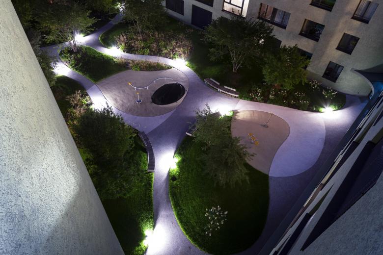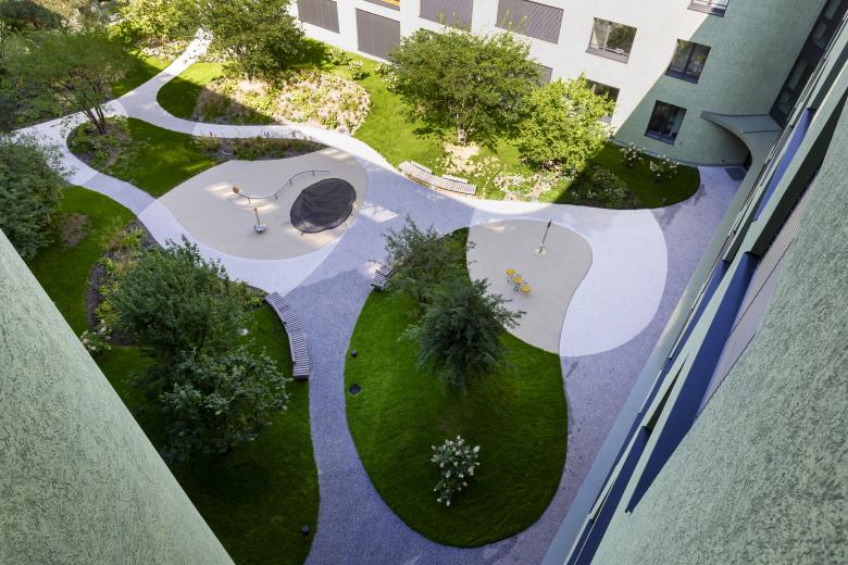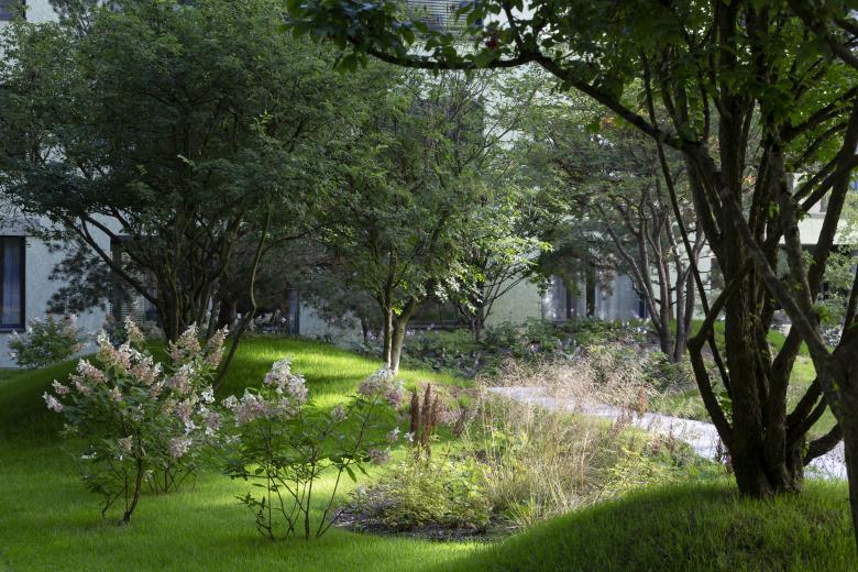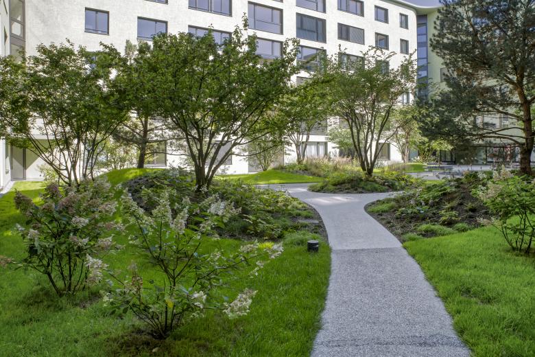 Immergrüne Föhren und Kleingehölze begrenzen hier den Raum nach oben und auf Augenhöhe und vermitteln so ganzjährig ein Gefühl von Geborgenheit. Hügelig angelegte Rasenflächen und Inseln mit bunten Blütenstauden und Ziergräsern lassen die Jahreszeiten in ihren jeweiligen Farben erleben. Mobile Sitzelemente und Kleinstspielgeräte laden zum entspannten Zusammensein in der attraktiven, abwechslungsreichen Landschaft des Innenhofs.