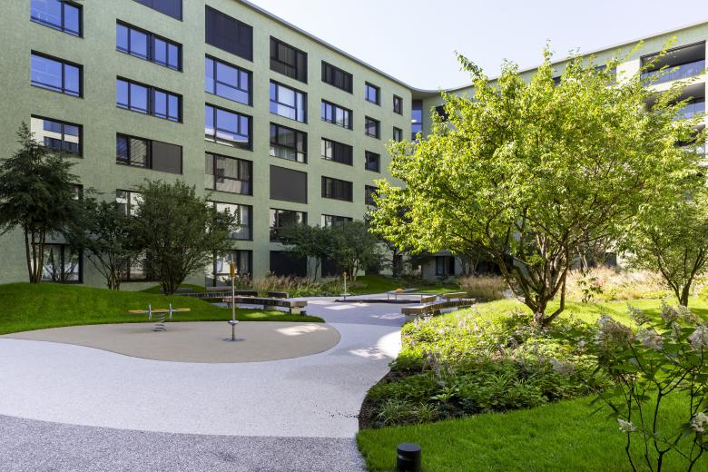 Die Gestaltung dieses ansprechenden Begegnungsortes mit öffentlichem Charakter führt durch seine ausgewählte Bepflanzung einen Dialog mit dem sorgfältig begrünten, barrierefrei durchwegten Innenhof. Dieser bietet Privatsphäre für die Bewohnerinnen und Bewohner und ist von aussen nicht direkt zugänglich.