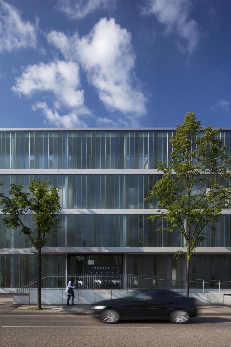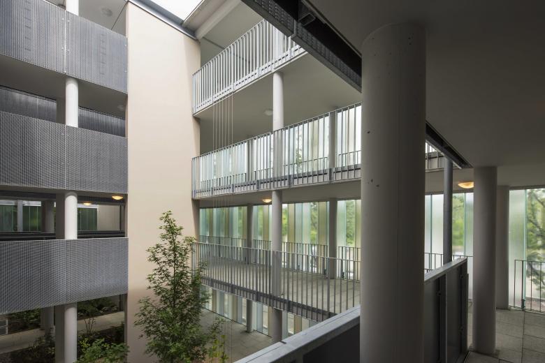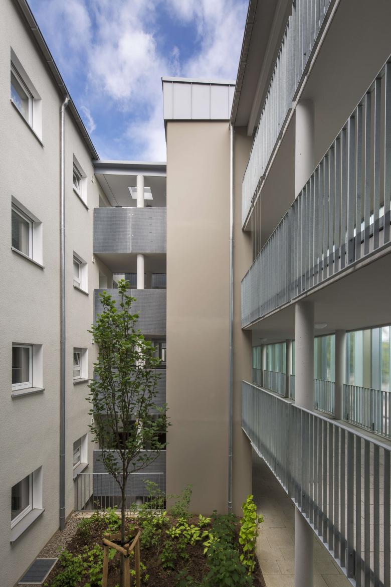 Subsequently our office were commissioned to redesign two existing timber-framed buildings. A special challenge consisted in the shielding of the building which is located directly on a major thoroughfare. We opted for shielding the traffic noise by created a “pergola”. This implies a newly created porch accommodating both the staircases and the central elevator. Pergola and main building are interconnected via a bridge construction. These open up to the four levels, each with six apartments.