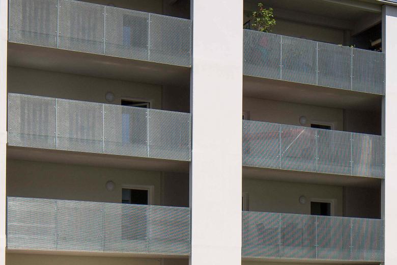 Since the original internal three staircases were no longer required, this resulted in a further advantage next to the noise protection: In the flats additional space for bathrooms and sanitary areas could be created. The photographs show the building before the structural change and then with the “pergola” in the foreground just off Jahnstraße in Göppingen (photos 1 to 7).
