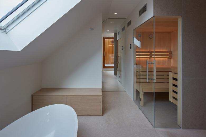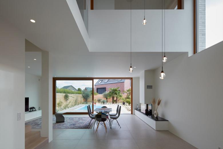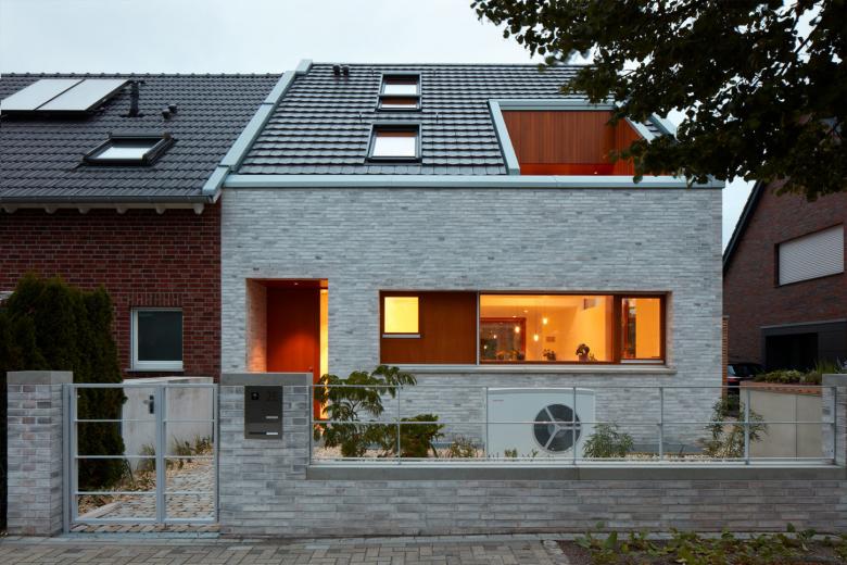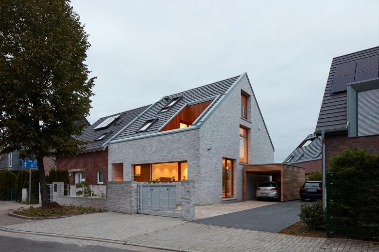 Geplant wurde ein Einfamilienhaus für ein junges Paar im Düsseldorfer Linksrheinischen, welches als Neubau an eine bereits bestehende Doppelhaushälfte angebaut werden sollte. Muss es sich Außen den strengen Restriktionen eines überalteten Bebauungsplanes unterwerfen, entsteht im Inneren ein über drei Geschosse reichendes Raumwunder. Durch eine zentrale Deckenöffnung im Erdgeschoss, sind sämtliche Räume optisch und auch physisch miteinander verbunden. Diese Maßnahme ist das entscheidende Raumelement, dass aus einer bescheidenen Ausgangssituation etwas Großes werden lässt.