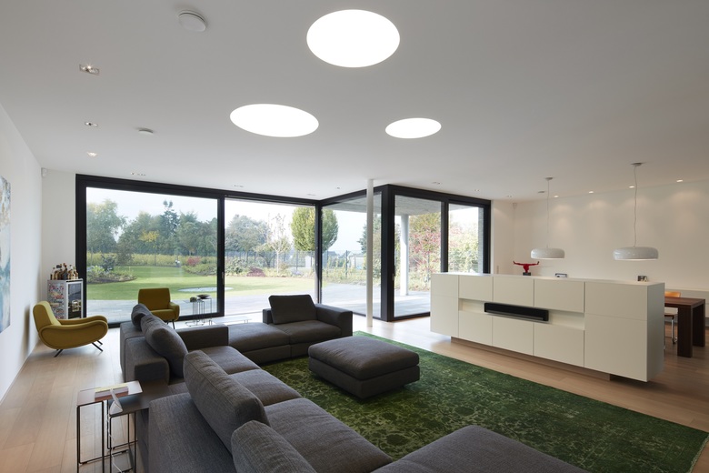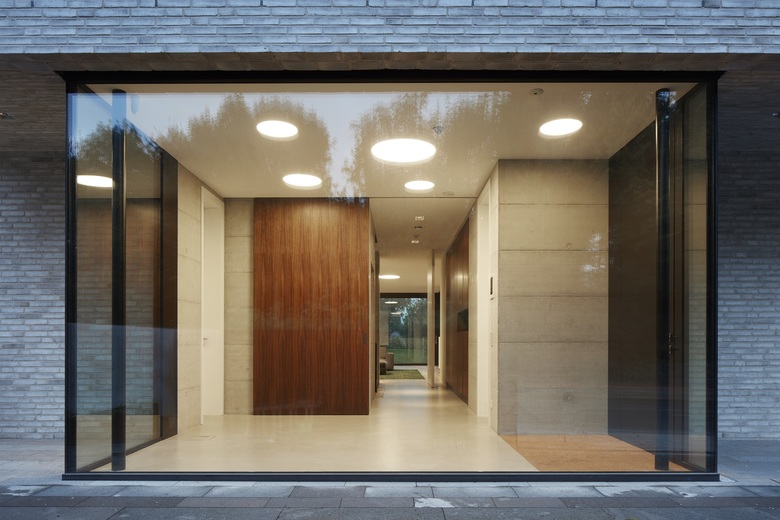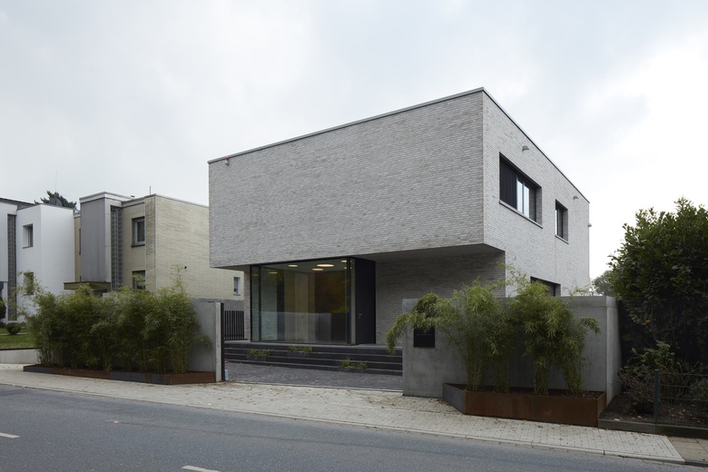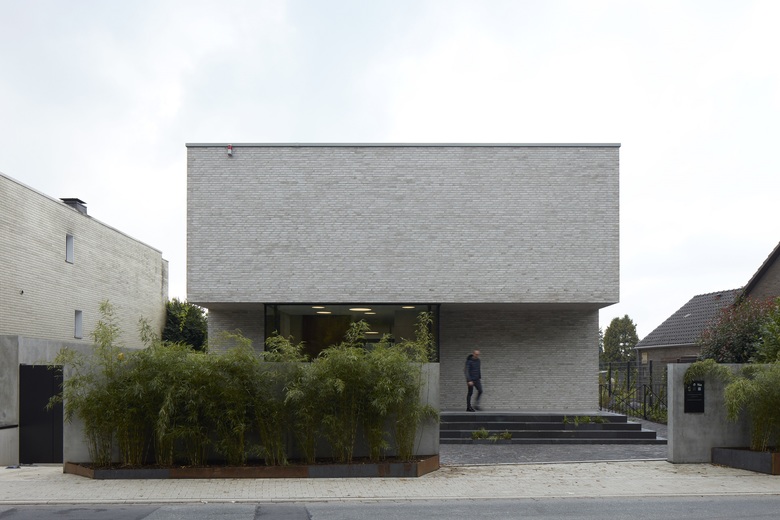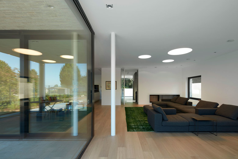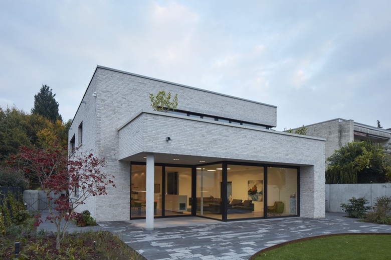 A compact edifice with bulky projections and offsets make for covered entrances and exits, terraces and a pergola looking towards the garden. An open and seamless ground floor creates accessibility and spaciousness, while an upper floor in classic arrangement provides the necessary intimacy for residents.