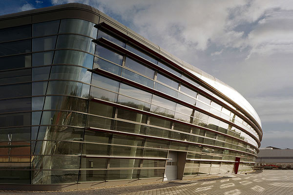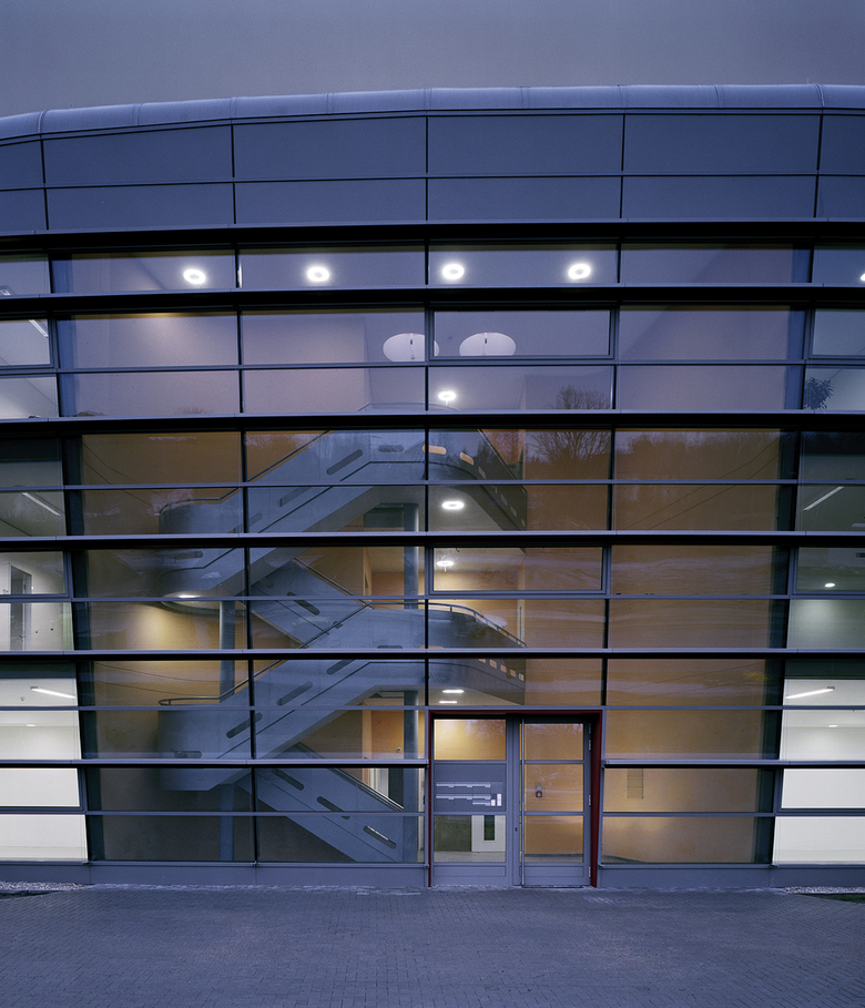 The “Centre for Aviation and Space Technology” in Wildau was designed as one single aerodynamic body. Located near Schönefeld Airport, Berlin, the building contains technology of the highest standard. It is here that Rolls Royce develops and tests their aircraft engines in high-tech test stands simulating all possible flight and height conditions. In addition, students of Wildau Technical College may also gain practical experience here. All appliances and its various complex installations are concentrated under a silver streamline aluminium shell. Thanks to inserted glass structures guiding the light deep into the office levels, the building is far from being a hermetic monolith, but rather represents a lively focus of movement and communication. Unexploited industrial land has thus successfully been revitalised and has gained unique visible prominence by three mighty turbine hall exhaust towers at the back of the building.