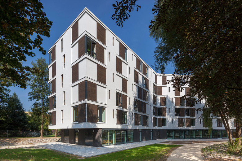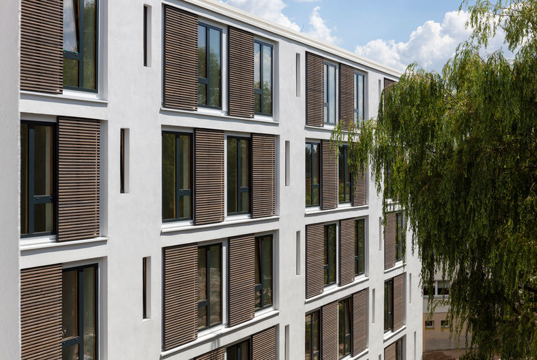 Each unit features generous windows to allow the residents unobstructed views to the park, taking reduced physical mobility into account. Elegant wooden sliding shutters help control natural lighting, whilst still allowing visual connection with the surroundings.