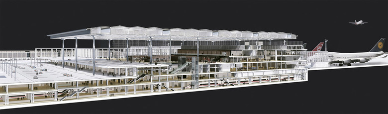 Changes in Berlin’s airports in 2012 will see the present main international airport Tegel closing and a new Berlin-Brandenburg Airport opening. The spine of the new airport is a central axis of parallel takeoff and landing systems on an east-west alignment. The main access fea-tures are arranged accordingly. The new passenger terminal consists of a main hall and adjoin-ing pier buildings. It is divided into two levels, separating arrivals and departures on the land-side. The main level is Departures, designed as a spacious, light-filled hall spanned by a filigree steel-and-glass roof. With its articulated facades and clear, geometrical shapes, the terminal incorporates architectural features from Schinkel to the Bauhaus.
