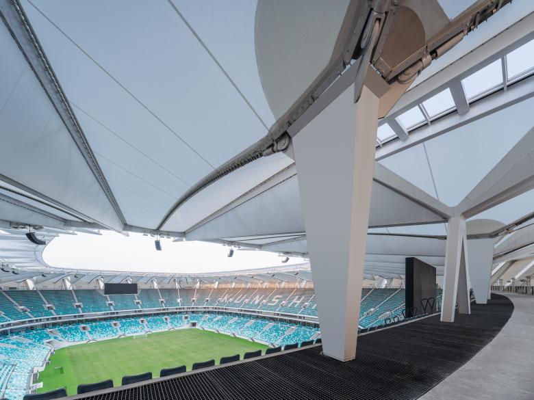 The stadium's oval shape is formed by 36 sturdy double frames made of in-situ concrete, spanned by intricate lattice steel trusses. This elegant, sculptural structure was developed in collaboration with schlaich bergermann partner (sbp). Translucent membranes are stretched between the double frames, allowing natural light to enter while also serving as both the facade and roof covering. With an area of approximately 600 square meters per membrane element, it is the largest single-layer membrane structure in China. An external bridge system ensures quick and seamless access: Wide staircases lead spectators to a surrounding podium, from which 48 bridges provide access to both the upper and lower seating tiers. The efficiency of this crowd management system was successfully demonstrated during the opening match.
