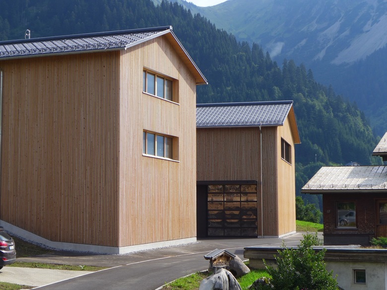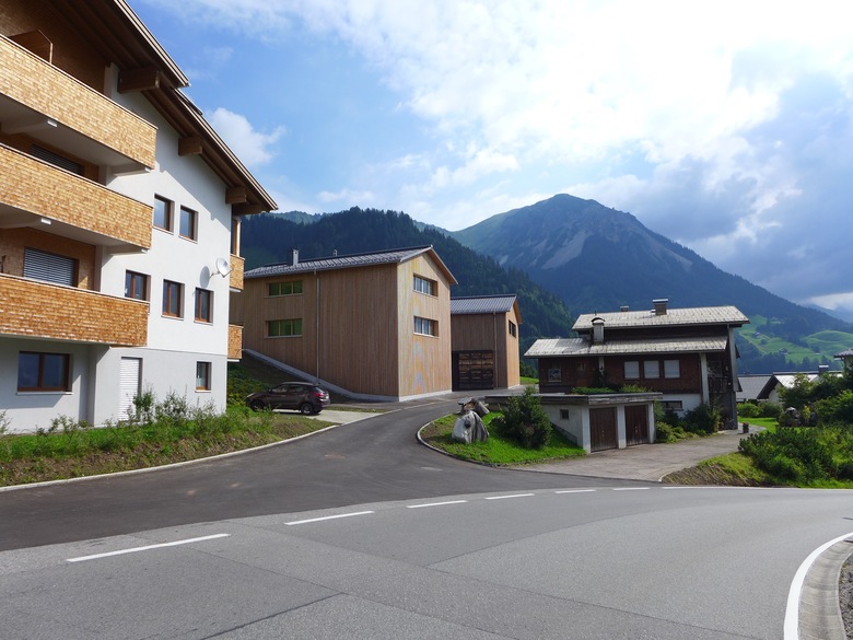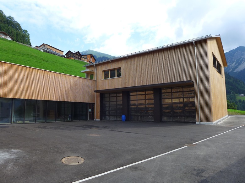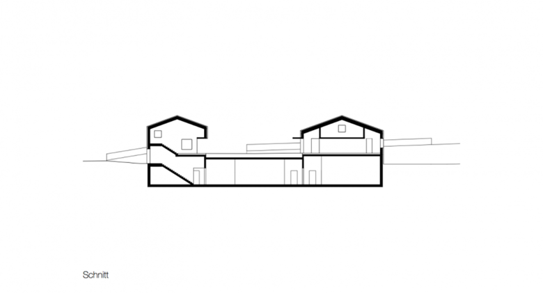 Das neue Vereinshaus besteht aus zwei durch einen Sockel hangseitig verbundenen Häusern mit Satteldach, giebelständig ins Tal gerichtet, traditionell in Dimension und Proportion. Zwischen den beiden Baukörpern liegt der geschützte Innenhof, ein vielfach nutzbarer Platz im steilen Gelände. Selbstverständlich fügt sich das Ensemble in die gewachsene Struktur des Bergdorfes ein und bewahrt so die ortstypische Maßstäblichkeit. Bergseitig, entlang der Faschinastraße zeigt sich das Gebäude bescheiden in den Hang geduckt, talseitig hoch aufragend wie im steilen Bergtal üblich.