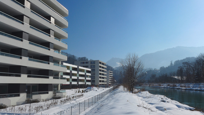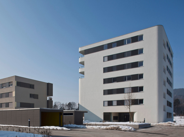 Alle Wohnungen im Haus E sind nach Südwesten orientiert. Das siebengeschossige Wohngebäude wurde als sogenanntes „Punkthaus“ - alle Wohnungen gehen aus von einem zentralen, Treppenhaus und Aufzug enthaltenden Raum - geplant. Es entsteht dadurch eine Halle, die sich über alle Geschosse zieht und über das Dach von oben belichtet wird. Die Ellipsenform des zentralen Luftraums und der Brüstung sorgt für die besondere Optik. Die farbigen Deckenuntersichten im Stiegenhaus und Zentralraum erzeugen je nach Blickwinkel spannende Kontraste. Die Abrundung der äußeren Gebäudeecken setzt sich im Inneren im Bereich des Stiegenhauses fort. Bei den Balkonen wurden die Brüstungen bewußt auf 70 Zentimeter Höhe reduziert und mit einem oberen Glasband versehen, um auch hier den Bezug zum Wasser und der umliegenden Bergwelt herzustellen.