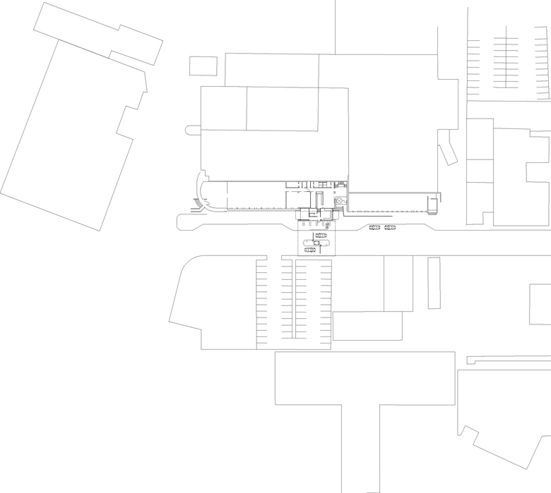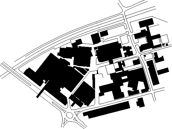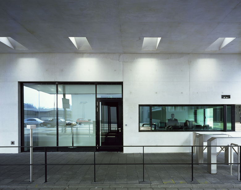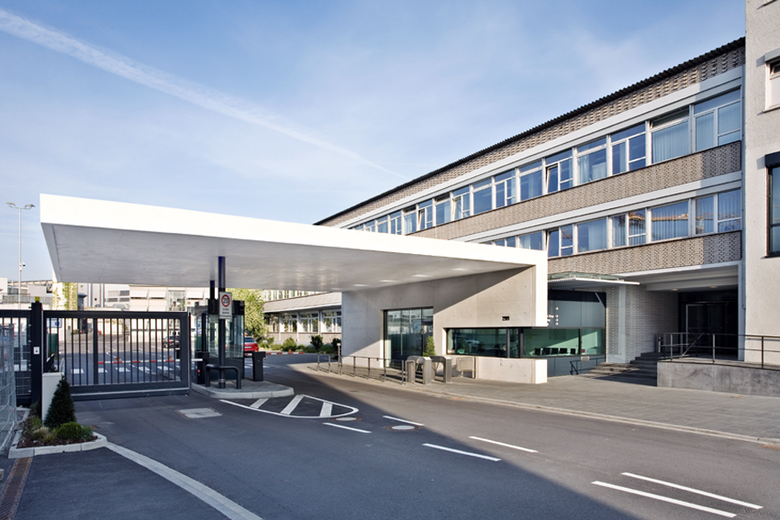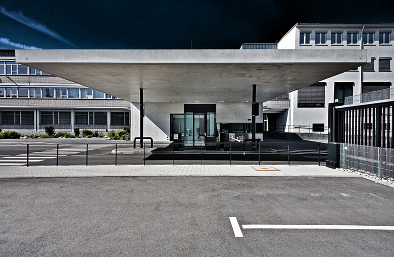 Für das zukünftige Werkstor sollte eine neue Eingangssituation geplant werden, der die unterschiedlichen Verkehrsströme in Einklang bringt. Industriegebäude aus den frühen 1960 Jahren von Rolf Gutbrod prägen diesen Bereich. Angesichts der kleinen Baumasse mit überschaubaren Funktionen schlagen wir einen massiven Winkel vor, der mit gebührendem Abstand vor dem Altbau „auf dem Kopf“ steht. Mit dem langen Schenkel bildet er die weit auskragende Überdachung, auf dem kurzen Schenkel steht er. Die Präsenz dieser Figur ist so kraftvoll, dass sie als eigenständiges Element erlebt werden kann. Die inneren Funktionen der Pforte liegen im Vergleich leicht konstruiert in der Glasfuge zwischen Winkel und Altbau. Das schlichte Material Beton wird hier bewusst durch Zuschläge, die eine alabaster-weiße Färbung erreichen, aufgewertet und kann darüber eine Verbindung zu den historischen Werksgebäuden aufbauen.