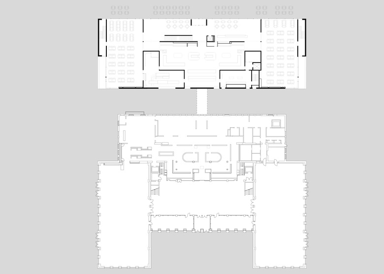 Eine Brücke verbindet beide Gebäude miteinander: Besucher gelangen auf der oberen Ebene (+7.68) vom Casino in den Neubau. Die achsiale Verbindung endet im Foyer auf einer Empore, von der aus man einen Blick über das Foyer und das Bistro auf den zentralen Platz hat. Die in der Casinoküche zubereiteten Speisen werden über einen Verbindungsgang auf Kellerebene des Casinos und über einen Aufzug zur darüberliegenden Ausgabe gebracht.