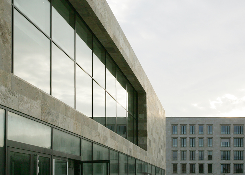 Der Anbau an das Casino ist die Schnittstelle zwischen Alt- und Neubauten. Er orientiert sich zum neuen Platz wie auch zu dem denkmalgeschützten südlichen Park. Flexibel unterteilbare Säle und ein großzügiges Foyer sind für den Mensabetrieb wie auch für Veranstaltungen gleichermaßen geeignet.