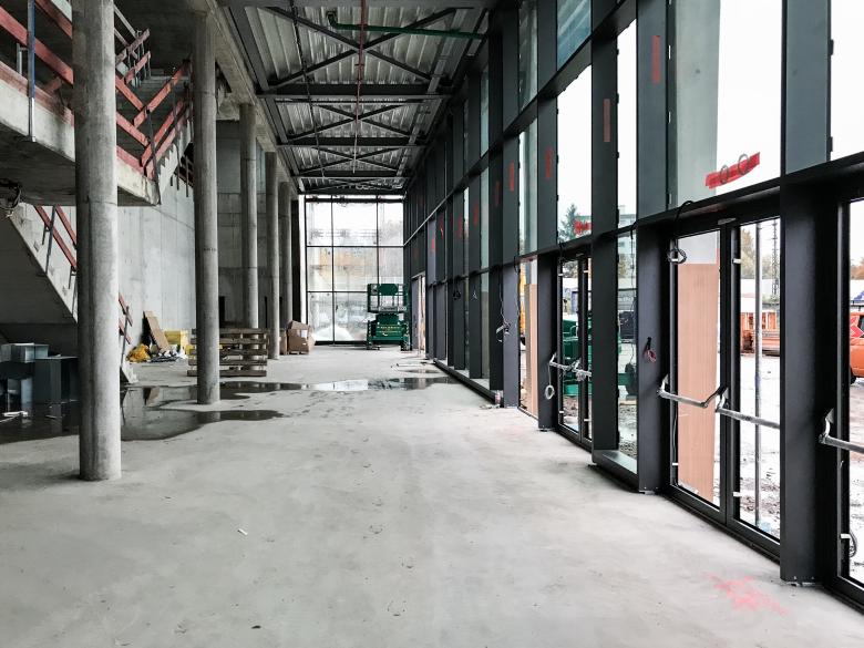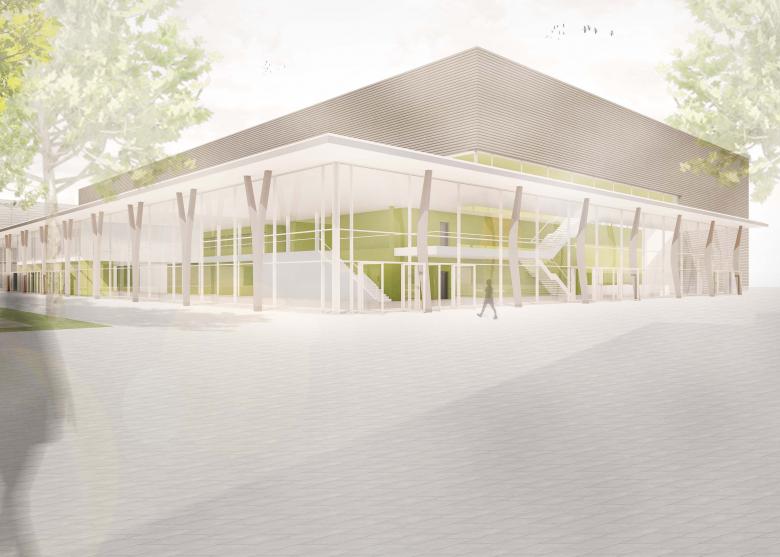 Eine der wichtigsten Modifikationen unseres Entwurfs liegt in der Verbesserung des Übergangs in die Baden-Arena (3). Mit der Verschiebung des Baukörpers um ca. 10m sowie einer leichten Veränderung der Hallenproportionen treffen alle Bestandstüren der Baden-Arena auf das neue Foyer und unter das Vordach. Mit der Verschiebung geht einher, dass die südliche Umfahrung und Andienung deutlich großzügiger wurden.