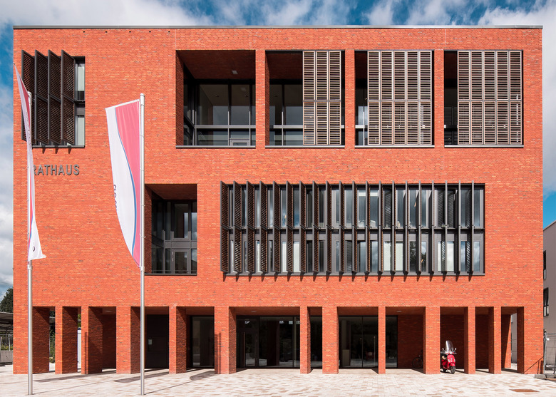 Als Reaktion auf die aktuelle städtebauliche Situation, aber auch um zukünftige städtebauliche Optionen offen zu halten, ist der Neubau von drei Seiten nahezu gleichwertig erschlossen: Einerseits über die östliche Arkade von Nord und Süden und anderseits im Westen durch das durch den Baukörper „gesteckte“ öffentliche Foyer. So findet der besondere öffentliche Charakter des Hauses Ausdruck in der Gestaltung einer offenen Halle, die alle Ebenen über eine elegante Freitreppe großzügig miteinander verbindet. Der Ratssaal liegt der Stadt zugewandt an exponierter Stelle an der nordöstlichen Ecke im 4. OG. Eine eigene, kleine Foyerzone vor seinem Eingang und eine rückwärtige, bedienende Zone ermöglichen einen funktionalen Betrieb. Als besondere Qualität des Saales wird nicht nur ein hoher, zweigeschossiger Raum (Lichte ca 5,80m) angeboten, sondern auch ein hohes, großes Fenster zur Stadt und zum Schlosspark, dem eine repräsentative Stadtloggia vorgelagert ist. Die Räume des Bürgermeisters und seines Stellvertreters sind ebenso wie der Saal direkt an diese Stadtloggia und an das kleine Foyer angebunden. Die Organisation des Grundrisses folgt dem Ziel der Übersichtlichkeit und Funktionalität. Die einzelnen Abteilungen werden zusammenhängend und jeweils mit der Möglichkeit einer ringförmigen Erschließung aufgereiht. Die über alle Geschosse reichende Halle und ihre Freitreppen dient der übersichtlichen Erschließung durch Besucher, zwei notwendige Treppen Räume schaffen auf kurzem Wege die Entfluchtungsmöglichkeit nach draußen. Das „offene“ Haus ist der Idealfall einer einladenden Behörde. Dieser Charakter wird erreicht, indem keine geschossweisen Brandabschnitte gebildet werden, sondern das Haus wird zur Kompensation flächendeckend gesprinklert und mit einer Alarmierung versehen. Diese Lösung ist in Summe wirtschaftlicher als aufwendige Brandabschnittstrennungen und kann durch die Ansonsten sehr wirtschaftliche und kompakte Grundrissorganisation des Hauses ausgeglichen werden.