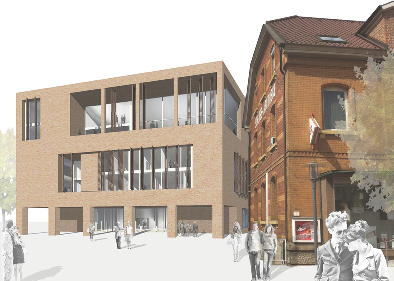 Das neue Rathaus wird als zentrales Gelenk zwischen Bahnhof, Hauptstraße und Schloss auf einer platzartigen Fläche angeordnet. Seiner besonderen Nutzung entsprechend ist es ein freistehender und repräsentativer Solitär, der nicht nur der gegenwärtigen städtebaulichen Situation gerecht wird, sondern gleichermaßen auch zukünftige Veränderungen in der Verkehrsführung ermöglicht. Zusammen mit dem Baukörper des Schlosses und mit möglichen zusätzlichen Neubauvolumen auf dem südlichen Gelände wird ein öffentlicher Raum aufgespannt.