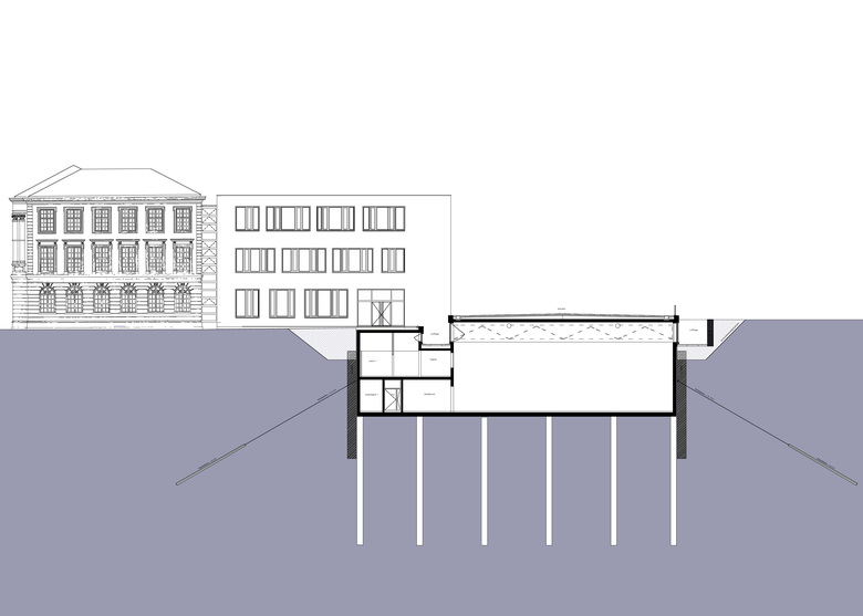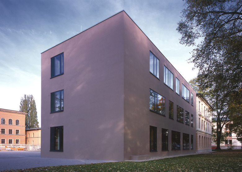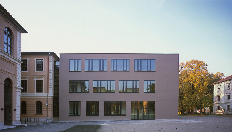 Städtebau – Das Ensemble der beiden Schulen stellt zusammen mit den Freiflächen und dem beachtlichen Baumbestand eine Substanz vonaußergewöhnlicher Qualität dar. Aus diesem Grund wurde als Ergänzung der Schule einen kompakten Baukörper vorgeschlagen, der sich in Volumen, Stellung und Erscheinung zurückhaltend gibt. Alle Neubauten antworten auf die Bestandsgebäude mit zurückhaltender Eleganz. Ruhige, mineralisch eingefärbte Flächen und Fensteröffnungen, die auf Proportion und Gliederung des Altbaus reagieren, bestimmen ihre äußere Erscheinung. Schule und Sporthalle fügen sich wie selbstverständlich ein, sprechen aber eine eigene, zeitgemäße Architektursprache. Das größte Neubauvolumen - die Turnhalle - wird zugunsten des Grundstücks im Gelände versteckt angeordnet. Dennoch ist sie wesentlicher Bestandteil der neuen Gebäudekomposition, da alle Baukörper in ein subtiles geometrisches Beziehungsnetz zueinander gesetzt werden. Es entsteht eine spannungsreiche Zonierung der Freiflächen und eine die Topografie unterstützende Terrassierung des Geländes.