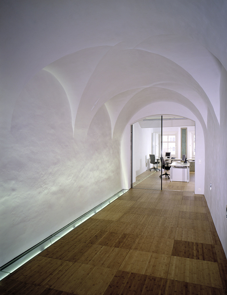 Strikingly narrow (only 6 metres wide and 60 metres deep), the building has the basic structure of a Late Gothic “long courtyard house” and is divided into main, middle and rear sections. The middle section has an arcaded courtyard. A special feature of the house is a meandering intermediate wall that perspectively stretches or foreshortens the room zones. The result is a complex sequence of spaces, courtyards and arcades, views outside and through-views with constantly changing perspectives. A very subtle addition to the historic structure using contemporary elements was built in three stages. The intense interweaving of exterior and interior, old and new, is evident particularly in the courtyards. From the ground floor to the second floor, the primary aim was to rehabilitate the historic building fabric. As the result of a city fire in the 18th century, the third and the fourth floors had few rooms worth preserving and were completely remodelled.
