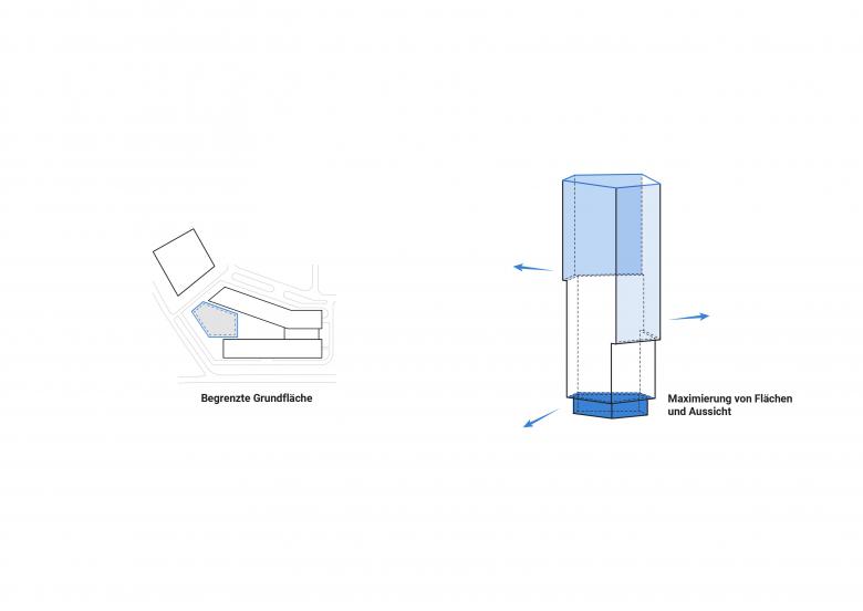 The tower base is nestled between two existing office wings, on the narrow space that is still free on the site. The pentagonal footprint of the new high-rise is the result of maximizing the given space on site. The relatively small floor area of the open base floors is extended in the upper office floors as the tower rises above the existing buildings towards the sky. This extension creates distinct cantilevers, which mark the entrance to the software park and relate to its urban surroundings: its neighboring buildings and the park. The tower’s sculptural overall shape is characterized by the consciously placed cantilevers and varies depending on the viewpoint.