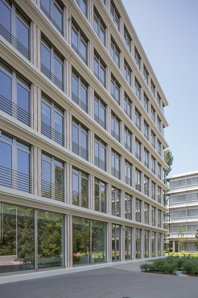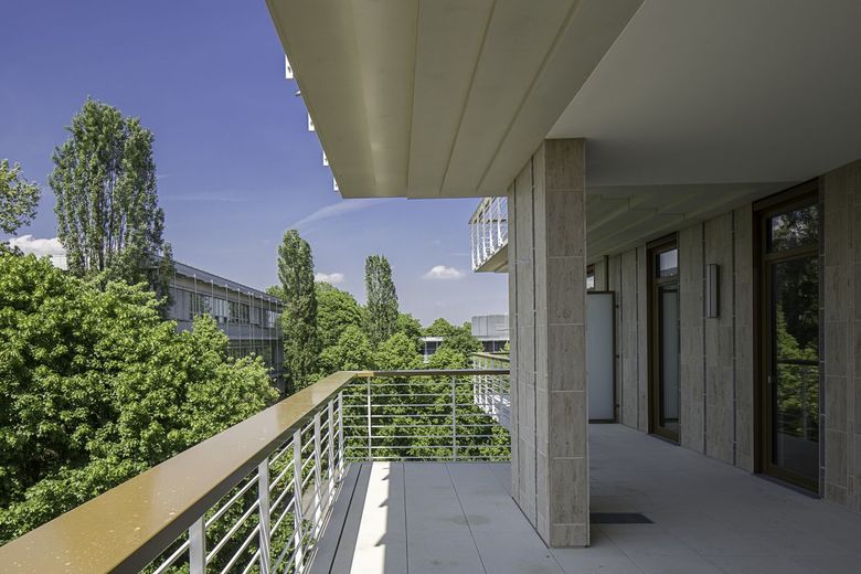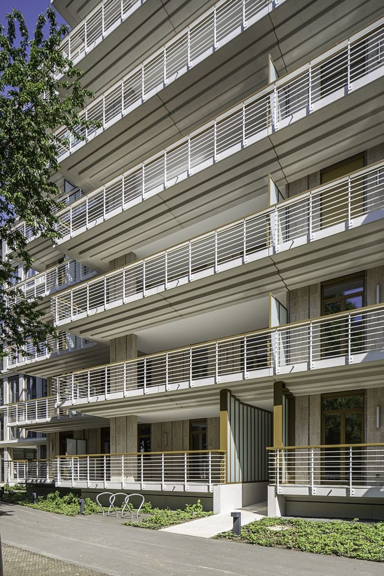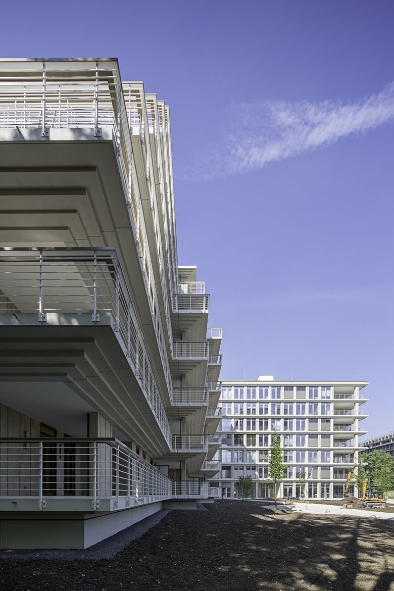 Andreas Hild, Dionys Ottl and Matthias Haber would like to see their design as homage to the site itself. The new buildings’ precast concrete skeleton construction follows the design of the surrounding structures, seen for example in the staggered terraces of the residential building. Generous balconies skirt the edifice, and together with the terraces of the office building create attractive open spaces. The balconies of the residential building are made of profiled prefabricated elements of artificial stone and correspond to the ceiling disks of the office building. The slim metal guardrails underline once again the arrangement of the buildings and the transparent appearance created through the architectural context.