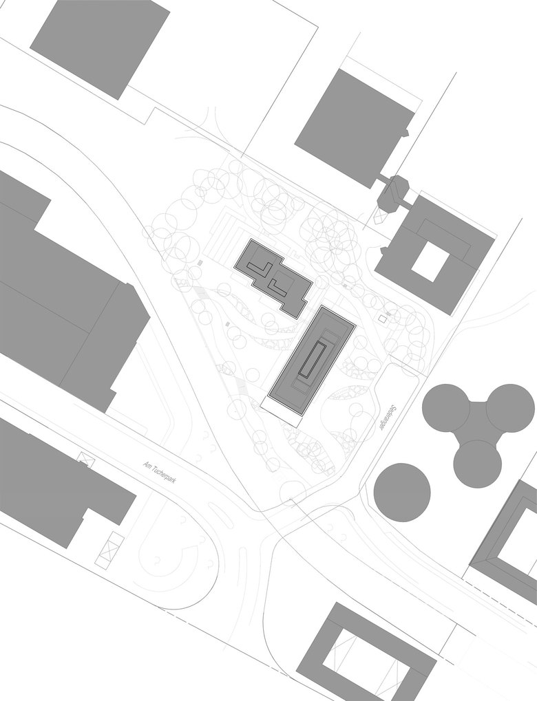 A one-storey underground garage was also built, the exterior walls of the existing garage were kept as pit lining. Parking spaces for the office buildings and private parking spaces are separated by a barrier and can be accessed from Sederanger.
