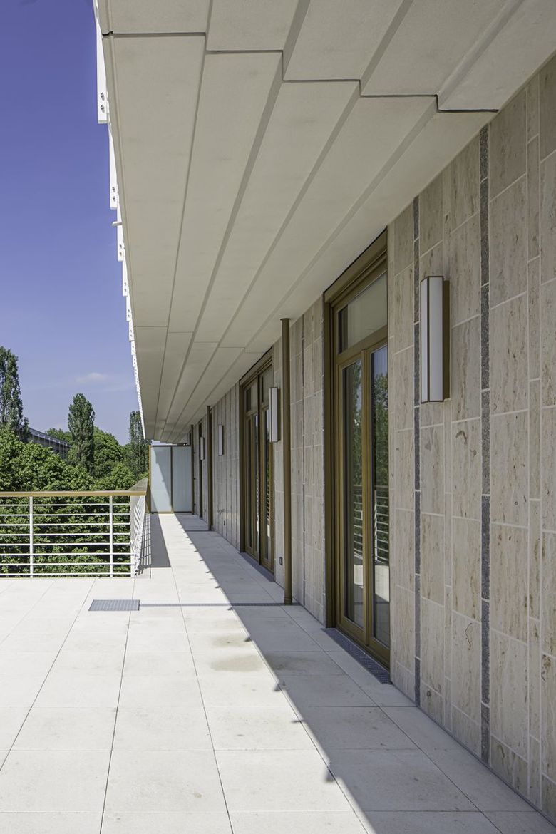 The facades enter relationship to the surrounding buildings, in a regular rhythm of light coloured columns and contrasting windows. Instead of using metal and glass as used on the other edifices on the site, we chose natural stone. This material on the one hand takes account of the particularity of having a modern office and residential building in this area characterised by administrative buildings from the sixties. At the same time the stone used and the particularities of the technique used to lay it are reminiscent of Sep Ruf, and the reconstruction period of Munich. Around the columns, dark shell limestone and light travertine create an attractive pattern, which in its small-scale fragmented arrangement purposely avoids any association to massive stone. As a continuation of the slabs on the columns, the walls behind the balconies and those at ground floor level are similarly veneered with natural stone. The remaining wall areas have a smooth render, which matches the natural stone slabs.
