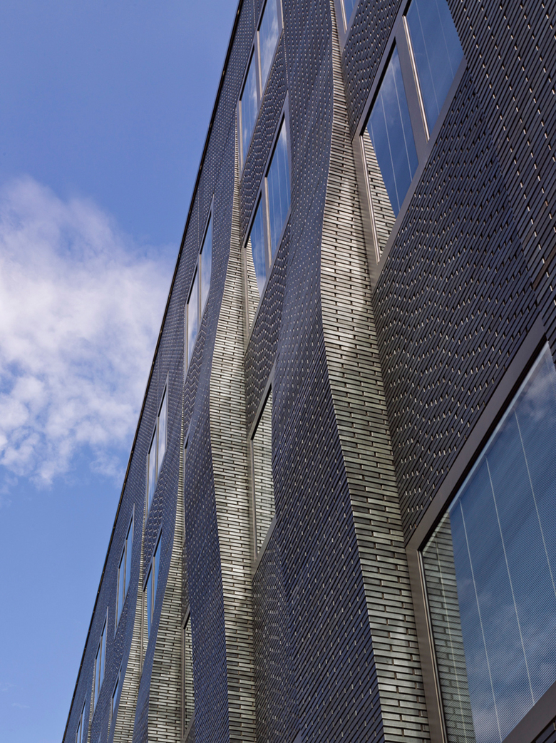 Alternating parapets and buttresses on the facade now echo the flight of the existing supports. From the second storey, they sweep back melding with the existing construction. The projection of the buttresses is graded upwards in a random manner. So, closest to the ground the buttress protrudes and then tapers vertically. The windows, flush with the facade, integrate optimally with the interplay of protrusion and plane. Their size and axis remain unchanged. Steel-grey clinker acts as mediator between the exposed bricks of the buildings from the fifties and sixties to the north and the aluminium facade of the new University buildings to the south. Simultaneously, the shimmering metallic surface serves to enhance the light breaking on the buttresses creating a vivid play of nuances and colours. The outer skin of bricks covers a layer of air and insulation to meet the highest modern standards.
