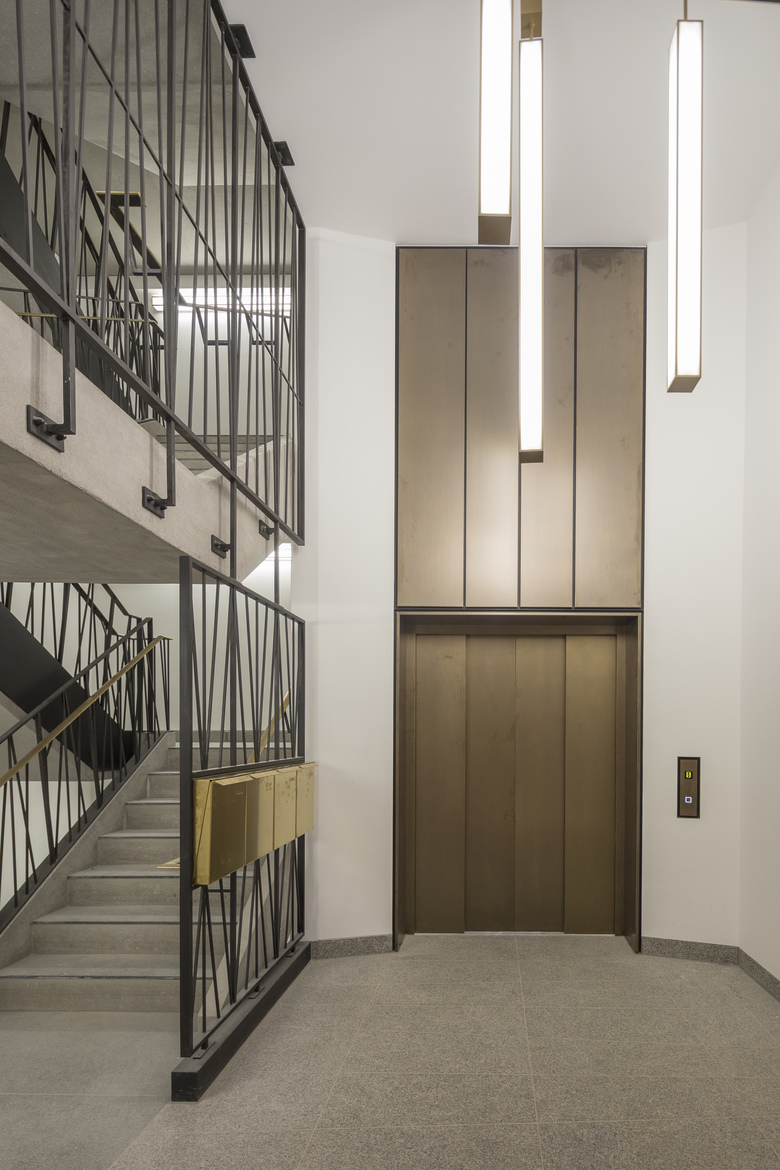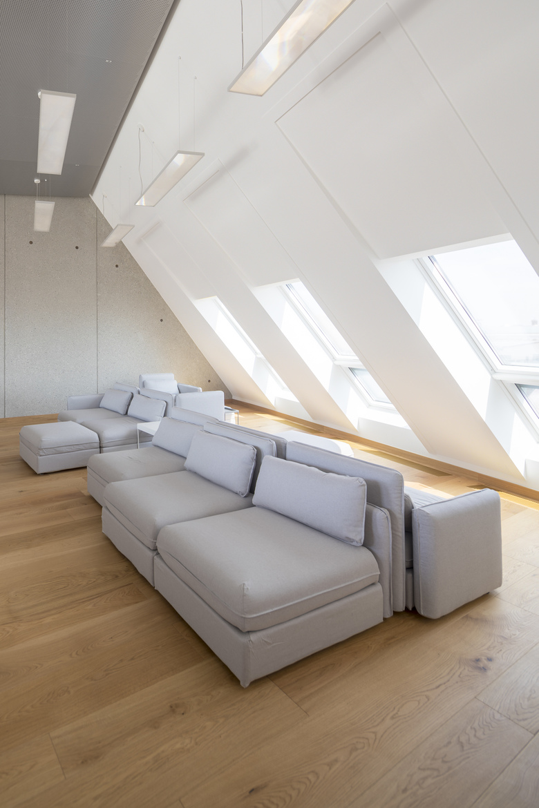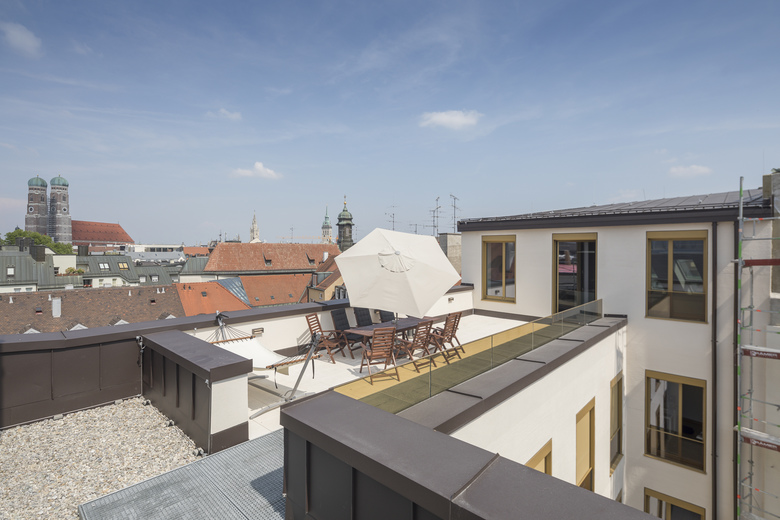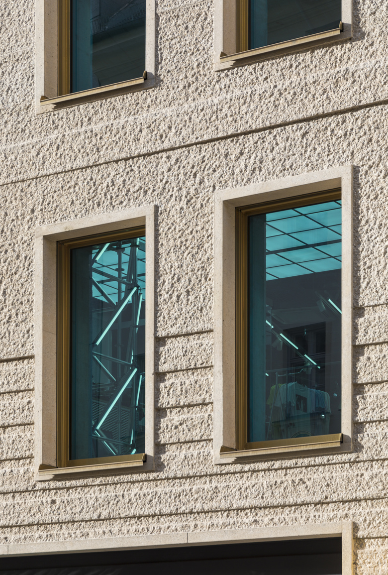 This office and commercial building lies in Munich’s historical centre. A particularity of the building site - a “bend” in the street affects the block edge structure of the building - was the fundamental inspiration for the overall design. A relief of horizontal ridges takes up the slanted outer wall and the various window shapes of the neighbouring buildings. The building appears chiselled out of the self-supporting in-situ concrete; an impression which is underlined by the surface structures of the material - ranging from smooth to bush-hammered and nidged. Harmonious proportions in this very narrow street view are achieved by having the windows become shorter the further they are up the building. The bronze hues of the window frames and fall protection railings match the sand coloured concrete façade.