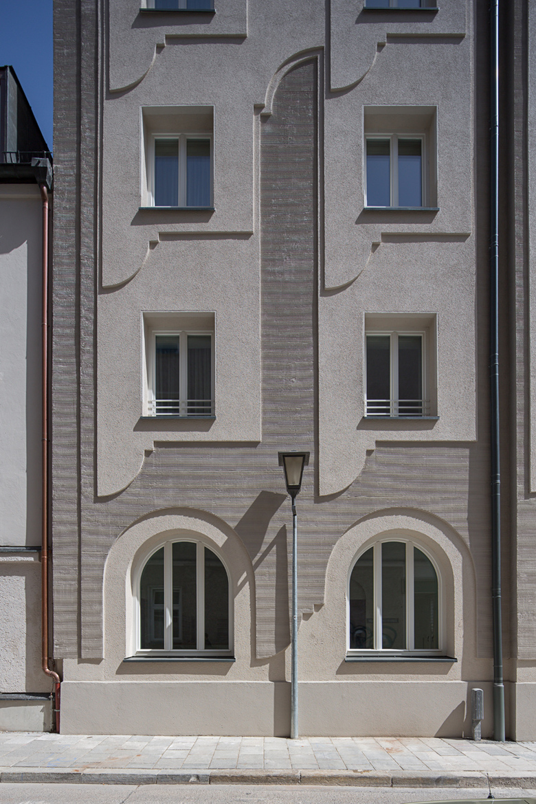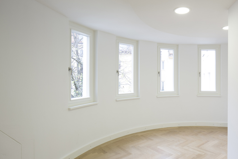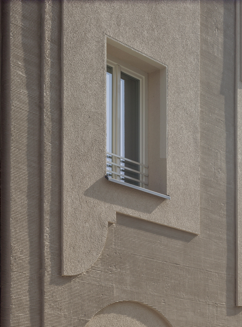 Additionally, as the building is situated close to various listed buildings, the composition of the new exterior needed to be carefully designed. The façade now presents itself as a modern interpretation of the surrounding traditional plasterwork, both as regards stucco ornamentation and plastering structures. The structural particularities of this building were the force behind this specific interpretation: As the thickness of the exterior walls decreases upwards, the required insulation thickness increases from storey to storey. This was used as a formal principle in the structuring of the façade. Simultaneously, flat surfaces, where water could collect and possibly damage the façade had to be avoided by all means. The relief has thus become a witness of the aesthetic handling of given structural conditions.