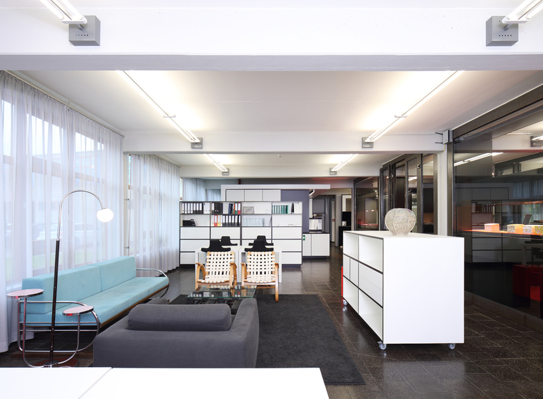 Aufgabe der Architekten war es in die denkmalgeschützte Struktur der hfg den Hauptsitz des Ulmer Schmuckunternehmen Ehinger-Schwarz einzuschreiben, sensibel gegenüber dem Denkmal und klar im Umgang mit der Markenidentität des Unternehmens. Der Innenausbau nutzt die Flexibilität des Gebäudes und stellt das Wesen von Ehinger-Schwarz in den Mittelpunkt: im gläsernen Tresorraum befindet sich die Kollektion und die Markenwerkstatt, in welcher das Neue ausprobiert und diskutiert wird. Rund um diese zentralen Einheiten gruppieren sich unterschiedliche Arbeitsbereiche wie Schmuckwerkstatt, Entwicklung und Marketing. Kommunikative Zonen fördern zusätzlich das Miteinander. Das flexible und bewegliche Möbelsystem ermöglicht dem international agierenden Unternehmen sich ständig neu zu erfinden.
