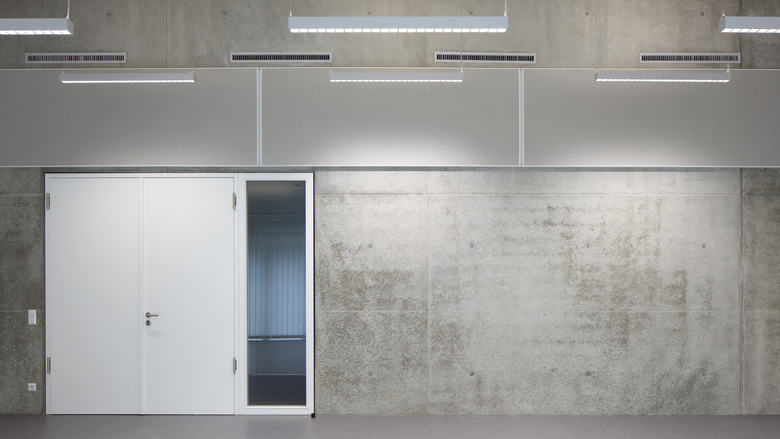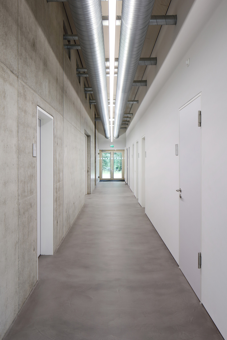das gebäude ist als 2-spänner konzipiert. über einen durchgehenden flur werden alle räume erschlossen. die büros sind l-förmig um zentrale funktionsräume angeordnet, der aufenthalts-/besprechungsraum befindet sich in der mitte des gebäudes und öffnet sich mit einer großzügigen verglasung zur natur. im nördlichen teil des gebäudes befinden sich die lager und technikräume mit separaten zugängen von außen.