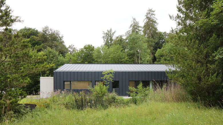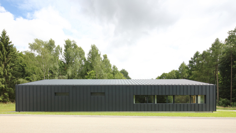 der neubau besteht aus einem nichtunterkellerten eingeschossigen baukörper mit satteldach. das gebäude besticht durch seine geradlinige form, ohne vor- und rücksprünge. einzig im eingangsbereich gibt es ein vordach, das sich formal vom hauptgebäude löst. traufseiten und dach erhalten eine hinterlüftete fassade aus aluminium-doppelstehfalz-blech, die sich wie ein „regenschirm“ über das haus stülpt. die giebelseiten werden mit einer witterungsbeständigen holzfassade verkleidet.