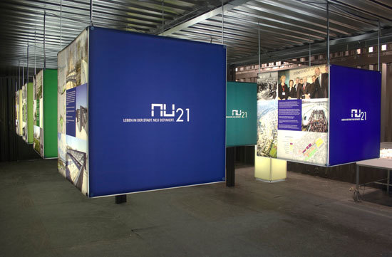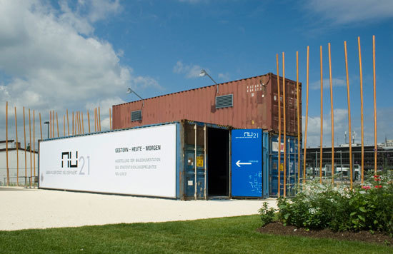 Der Pavillon NU21 ist ein temporärer Bau während der Landesgartenschau 2008 zum Thema "Leben in der Stadt Neu-Ulm". Im Containerdorf werden Informationen zu den aktuell stattfindenden, städtebaulich umwälzenden Veränderungen in Neu-Ulm präsentiert. Die gestapelten 42“ Seecontainer machen das Gebäude wahrnehmbar und geben den abgehängten Lichtkuben im mattschwarzen Innenraum einen Rahmen. Das Projekt musste unter hohem Zeitdruck und mit geringem Budget umgesetzt werden.