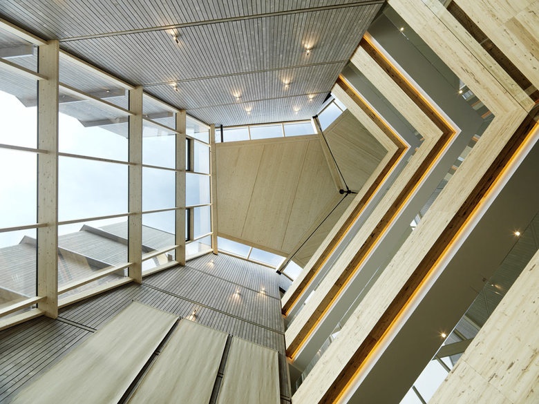 Despite the fact that all three wings are linked to one another by means of a glazed atrium, which also provides vertical access, each one was still treated as an independent structure in order to establish clear formal principles – a statement that was underpinned, for instance, by consequently cladding all outer wall surfaces with a timber façade.