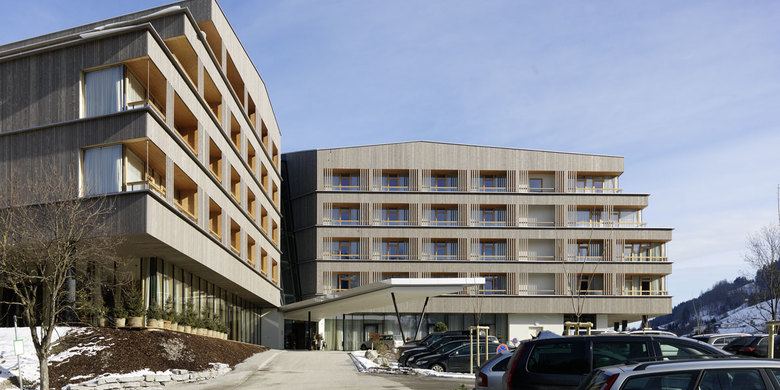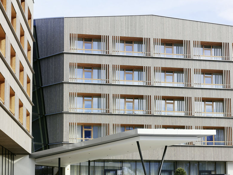 While the structural core of the building consists of reinforced concrete dividers and floors, the outside layer with the loggias and the ceiling of the atrium that is visible from the inside are of plywood boarding. All windows, doors, floors and balustrades, as well as the interior views of the loggias and the façade are made of timber. Featuring vertical, glazed spruce cladding, partly fashioned to form lamella-like slats as a protective screen in front of the loggias, there is more to the exterior than meets the eye. This diversified façade not only helps to put the size of the hotel into perspective, establishing a link with its timber cladding to the neighbouring “Congress Schladming” and to the surrounding countryside and region as a whole, but its clear-cut design spells out the kind of ambition that is bound to leave an indelible mark on Schladming’s urban landscape.
