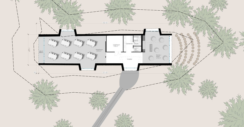 Der „Baumstamm“ liegt nur optisch auf dem Waldboden auf. Das eigentliche Waldzimmer steht auf Lärchenholzpfählen und berührt den Waldboden so nicht. Der Hohlraum bietet der vielfältigen Fauna Unterschlupf und Geborgenheit. Einzig der kleine Lagerraum, direkt neben dem Zugangssteg, ist für die Verbindung zur „Mutter Erde“. Sie kann unter anderem eine autarke Energie- und Entsorgungsstation beherbergen.