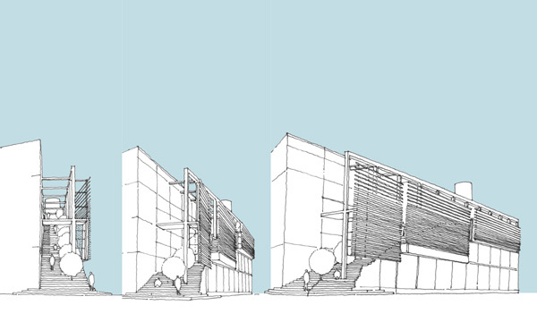 2. VDB ARGENT is a proposal for an office building on a corner site. The southern facade is protected using an aluminum screen and an external stair with gardens. This public realm is to be used by the tenants to get to the cafeteria on the roof.