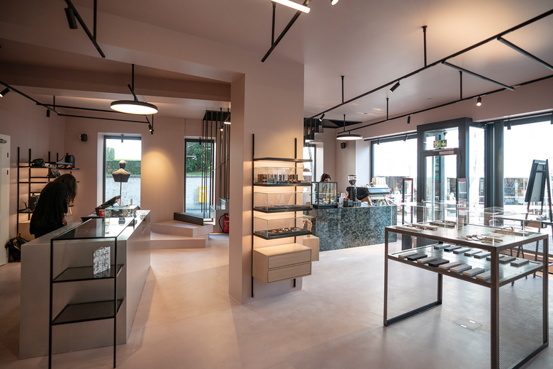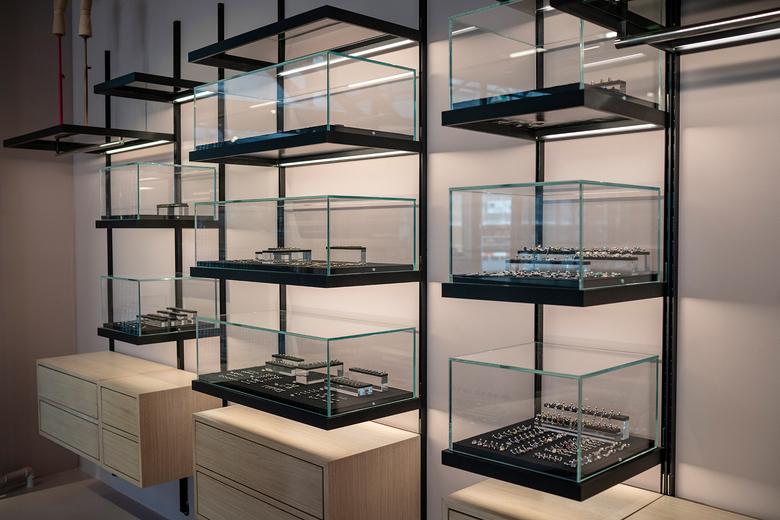 In addition to four tattoo and one piercing rooms on the 1st floor, on the ground floor clients can find piercings, jewelery, accessories and care products presented on filigree, under-lit shelving systems, even more emphasized by glass cubes and drawer furniture. The self-designed aluminum-clad cashier desk and the coffee counter top made of solid Verde Maritaca granite make very clear statements.