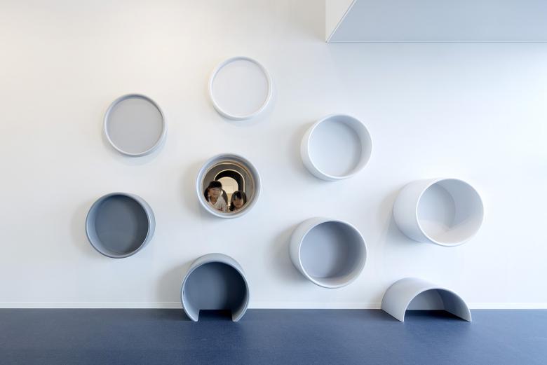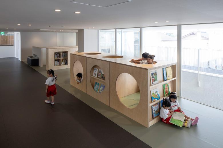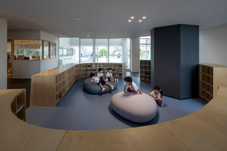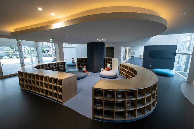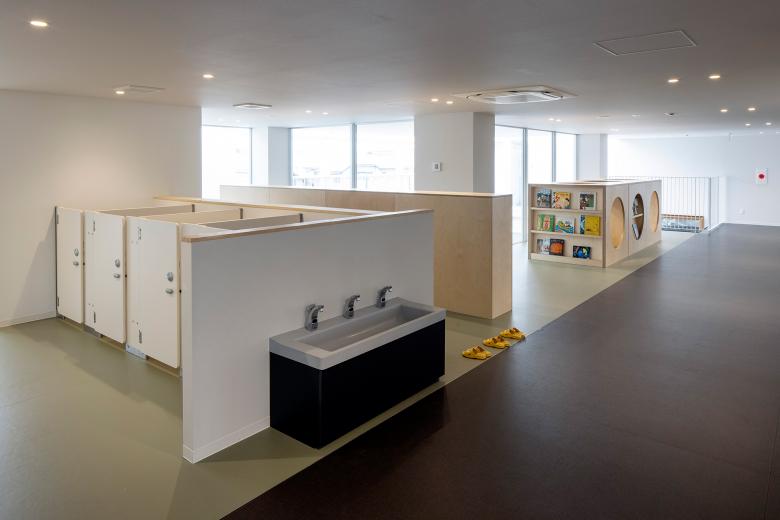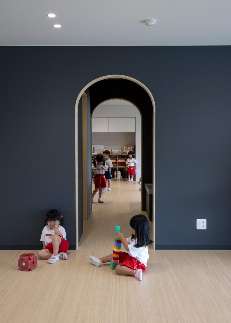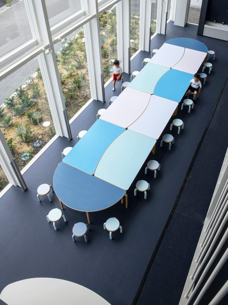 The theme of the preschool building was “a space where children can think for themselves and stimulate their imagination” and “a preschool that is like a museum. Dark gray boxes were placed in each room to blend in with the piano. The color of the classrooms and the shape of the wooden crates were changed for each grade level so that the children could identify their class. The lunch tables were made square or round, or connected to form a wave shape, so that the space could be changed according to use and number of children.