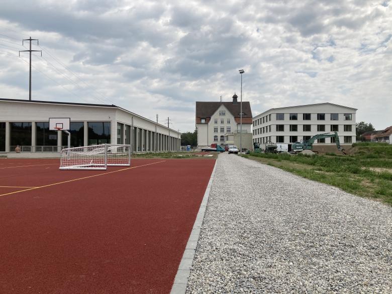 Neubau einer Schule, eines Kindergartens und einer Turnhalle als Erweiterung zum bestehenden alten Schulhaus, inklusive Umgebungsplanung von Sportflächen