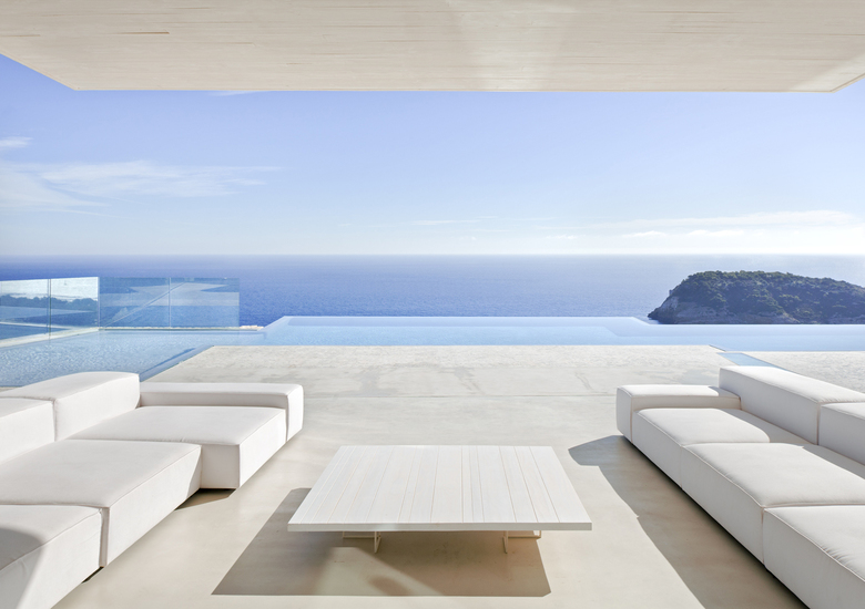 Un conjunto de muros de hormigón blanco se disparan en diferentes direcciones, comprimiendo y expandiendo las visuales, generando múltiples escenas. Los planos verticales quedan acotados por largos voladizos horizontales que se extienden buscando el mar, generando porches que delimitan el extenso espacio de la terraza. Por su sistema constructivo, los voladizos no se apoyan en los muros, sino que se encajan entre ellos, aumentando la tensión visual y creando sensaciones contradictorias entre masividad y liviandad.