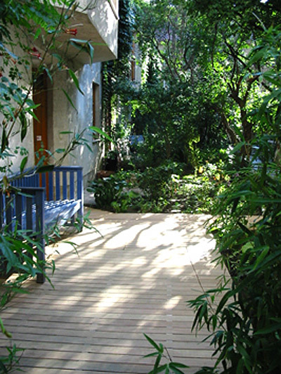 The courtyard in the Kettenbrückengasse in Vienna 5th district is shaped by fragments Biedermeier houses interspersed - into the higher houses of the Fin de Ciècle. Along the court yard are new organised housing units such as private rawhouses. Although the courtyard is contrary to the housing units community possession, the question of the private use before the own house input arose. The concept was to be enabled beside community surfaces also a private use of the house before areas.
