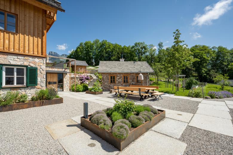Der alte Obstbaumbestand mit seinen traditionellen Sorten wurde um neue Sorten und Nussbäume erweitert. In der Nähe des Feldkastens wurde ein Naschgarten mit verschiedenen Beeren angelegt. Vor dem Haupthaus befindet sich ein "Dorfplatzl", an dem sich die Gäste an einem großen Tisch unter einer Linde treffen können. Der Bodenbelag besteht aus durchlässigem Kalkschotter, der natürlicherweise im Ausseerland vorkommt. In frequentierten Bereichen wie Sitzplätzen und Zugängen wurden Natursteinplatten in den Kalkschotter verlegt. Das Haupthaus wird von duftenden Stauden begleitet, die in Farbe, Höhe und Blühzeit harmonisch aufeinander abgestimmt sind. Prächtige Rosen und Hortensien ergänzen diese Bepflanzung. Bei der Auswahl der Pflanzen wurde darauf geachtet, dass sie den klimatischen Bedingungen entsprechen und von Frühjahr bis Herbst unterschiedliche Blühphasen aufweisen.