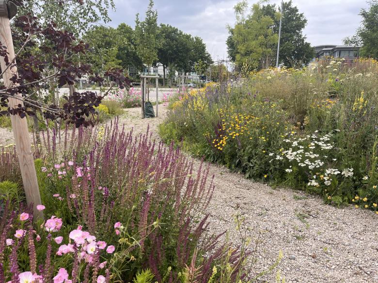 Die Leitidee besteht darin, die Vegetation mit Gehölzen wie Birken, Kiefern und Rosmarinweide zu ergänzen und so eine dynamische Sukzession einzuleiten. Der Sukzessionspark zeigt eine beeindruckende vegetationsökologische Entwicklung auf einer Kiesfläche, die mit Wiesensalbei, Kamille, Oregano, Nachtkerze, Königskerze sowie zahlreichen Wildkräutern besät und mit Stauden wie Steppenkerzen, Wolfsmilchgewächsen und Kandelaber-Ehrenpreis kombiniert wird. Gräser und Kleingehölze verweben sich mit dieser Vielfalt zu einem lebendigen Gefüge, das über die Jahre immer artenreicher wird.