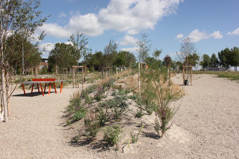 Die Gestaltung basiert auf einer dreidimensionalen und topographischen Modellierung mit Schotter, Steinen, Hügeln und Schwemmholz. Dadurch entsteht eine abwechslungsreiche Landschaft mit unterschiedlichen Höhenschichten und Windschutzstrukturen. Kalkschotterwände aus Lehm, Tegel und Schotter schaffen windgeschützte Sitzkojen, während versickerungsoffene Dolomit-Kantkorn-Beläge und Versickerungsmulden am Parkplatz die Durchlässigkeit und ökologische Funktionalität gewährleisten.