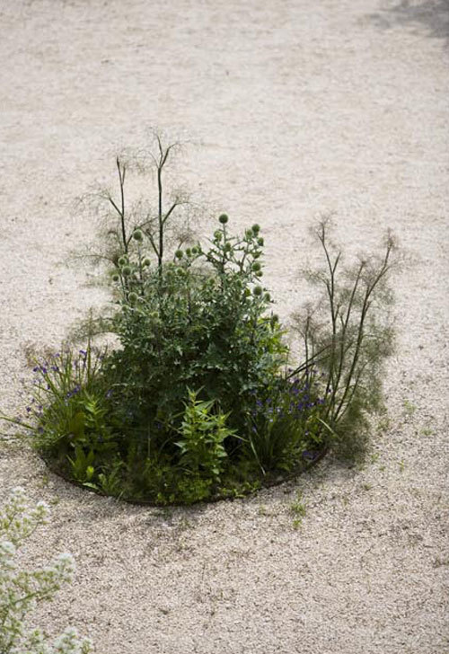 Due to the many usage requirements of the courtyard, the balance between vegetation and paved area should be reversed by creating small garden plots. A layer of paths and access roads was applied on the courtyard pattern. This structuring yielded the plot locations. Each plot represents an independent part of the garden with specific plants or functions: the “hot spot” for grilling fires, the “water plot” as open-air shower, the “kitchen plot” as bed of herbs. “Plant plots” provided colourful flower spots in the courtyard. This plot concept is flexible enough to allow adaptations for new requirements. If children live in the house, one of the “plant plots” can easily be converted into a “sandbox plot”.