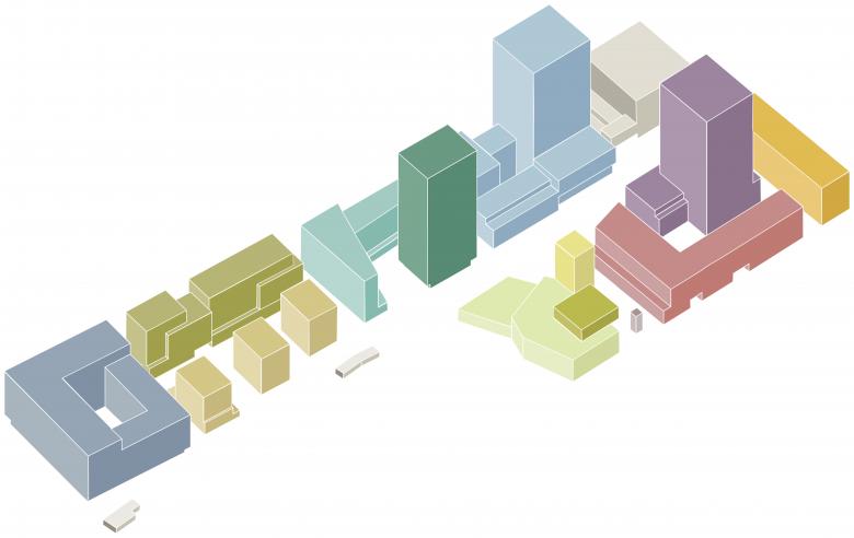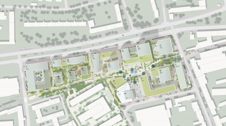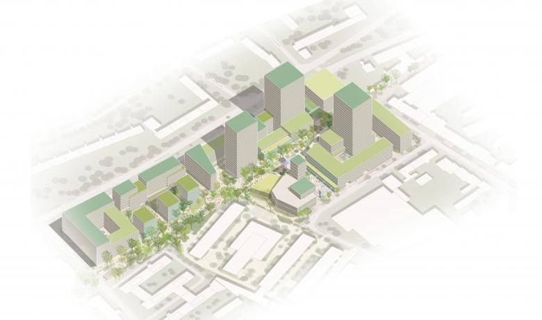 The design approach capitalises on neighbourhood’s heterogeneous urban context to foster diversity and a unique character. The design draws on this conditions by combining different typologies, heights and architectural designs - from perimeter block to high-rise, from apartment building to industrial element – into a contrasting urban ensemble. A sequence of orthogonal building plots and complementary typologies sit along the public spine, thus ensuring a lively streetscape. The urban composition has been carefully modelled to create a comfortable micro-climate in the open spaces. Aim is for the area to become a lively neighbourhood with high-quality architecture and inviting open spaces. A lush landscape of larger and more intimate public spaces and roof terraces offers lively and sheltered public spaces with a variety of climate-adapted vegetation. Built around a metro stop and flanked by a new tram line, the site’s excellent accessibility is further strengthened by a mobility concept offering a variety of transport modes, from bicycle sharing to electric vehicles. This adds up to the ambition to make maximum use of renewable energy, and to reduce to carbon emission.